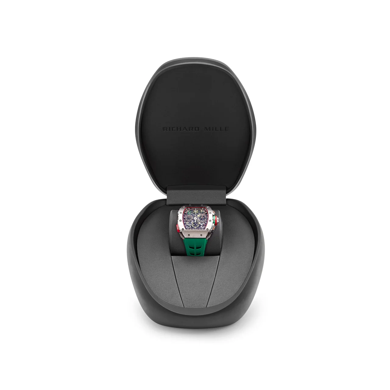 At the heart of the RM 65-01 beats the caliber RMAC4, a skeletonized automatic winding movement that powers a range of complications with effortless precision. These include hours, minutes, and seconds at 6 o’clock, a date function, and a split-seconds chronograph with a 30-minute counter at 3 o’clock and a 12-hour counter at 9 o’clock. A function selector, rapid winding, and variable-geometry rotor further enhance the watch’s functionality, ensuring optimal performance in any situation.